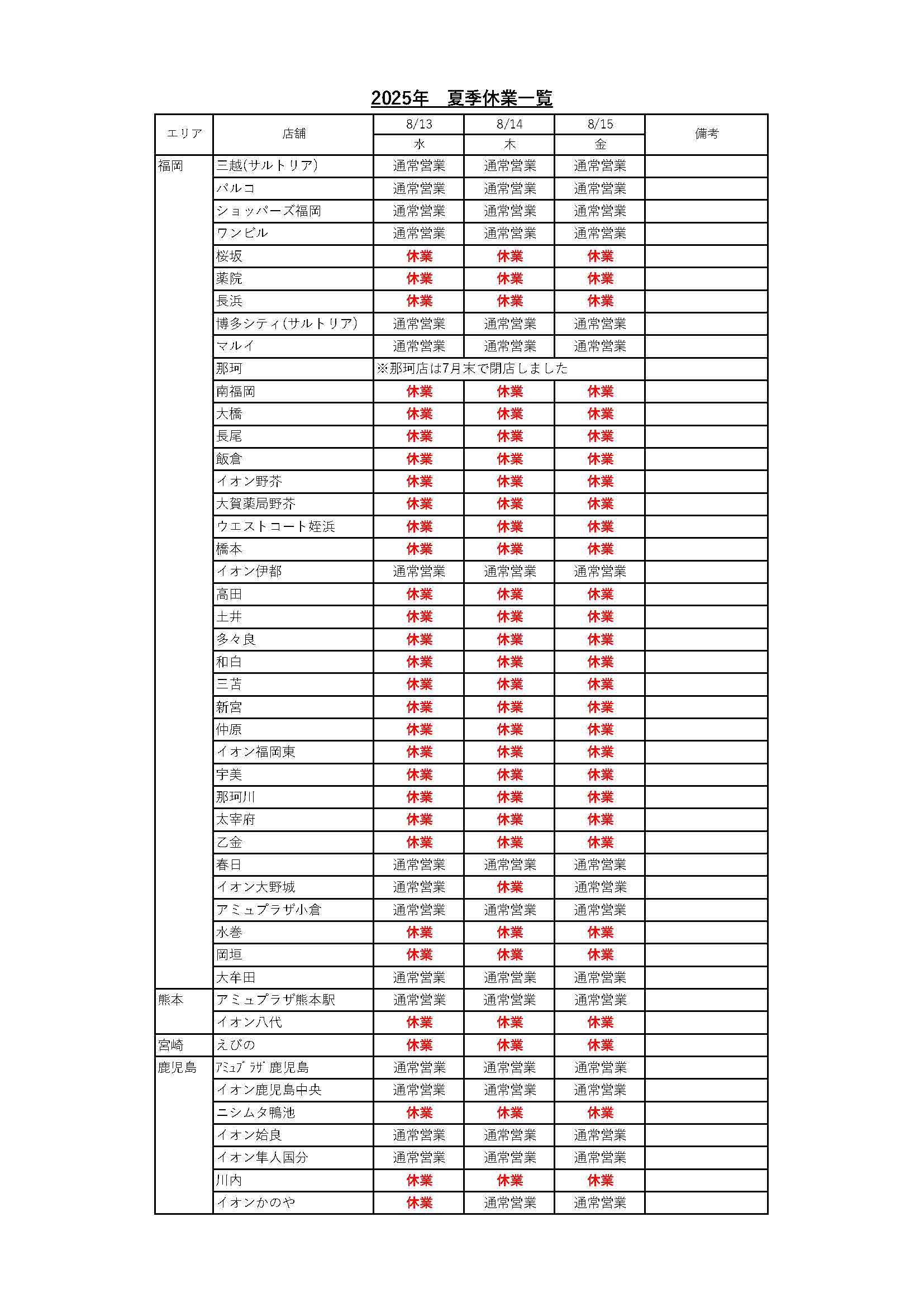 2025年夏季休業店舗