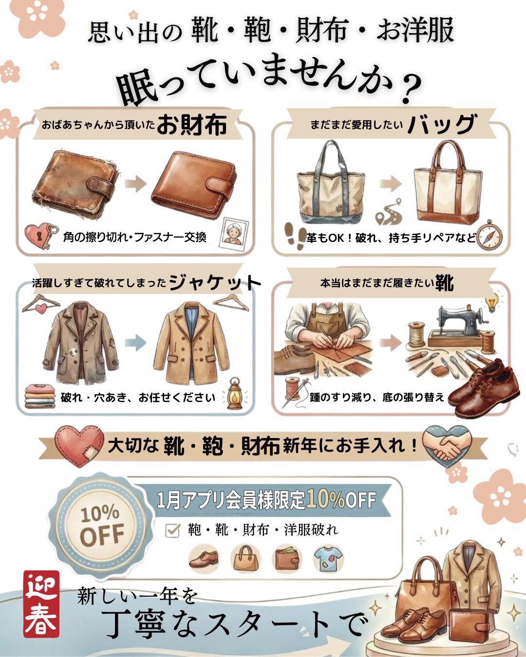 1月は「靴・鞄・財布の修理&洋服の破れ直しが10%OFF!」