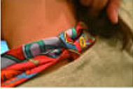 - ●セーターの衿に余った布地でリボンタイ用の通しを。