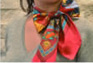 たとえば・・アスコットタイ風に、後ろもスッキリするように。せっかくですから、エルメスの文字が正面に出る様にして・・。残りはポケットチーフにしたらいかがでしょう?」